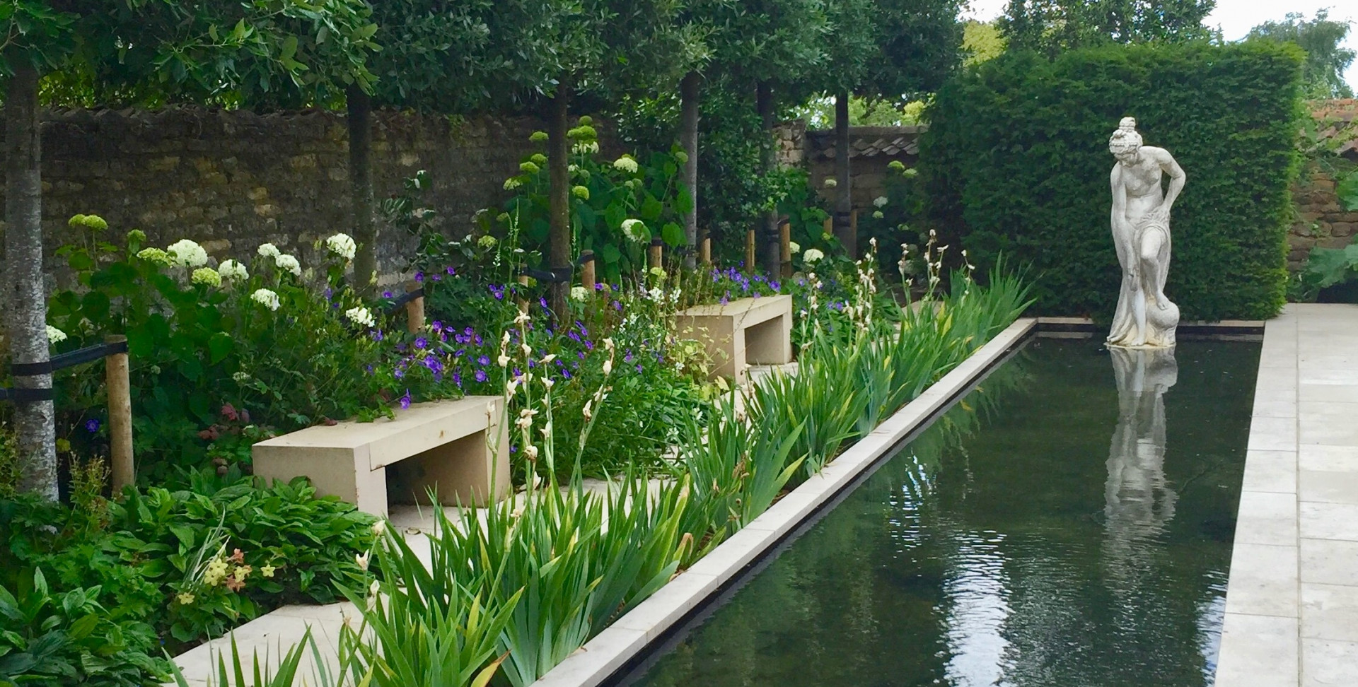 Our brief was to create a courtyard garden with a neo-classical inspiration and, with the exception of existing sculptures that the client wanted to feature in the garden, we started with a totally blank canvas. We introduced a number of level changes to align with those determined by the barn and the new extension and created a series of different garden ‘rooms’, each identified with their own planting style. Trees were used to signpost within the new spaces that included a water garden with a reflective pool; long central borders; a terrace for entertaining and terraces on two levels by the old barn.